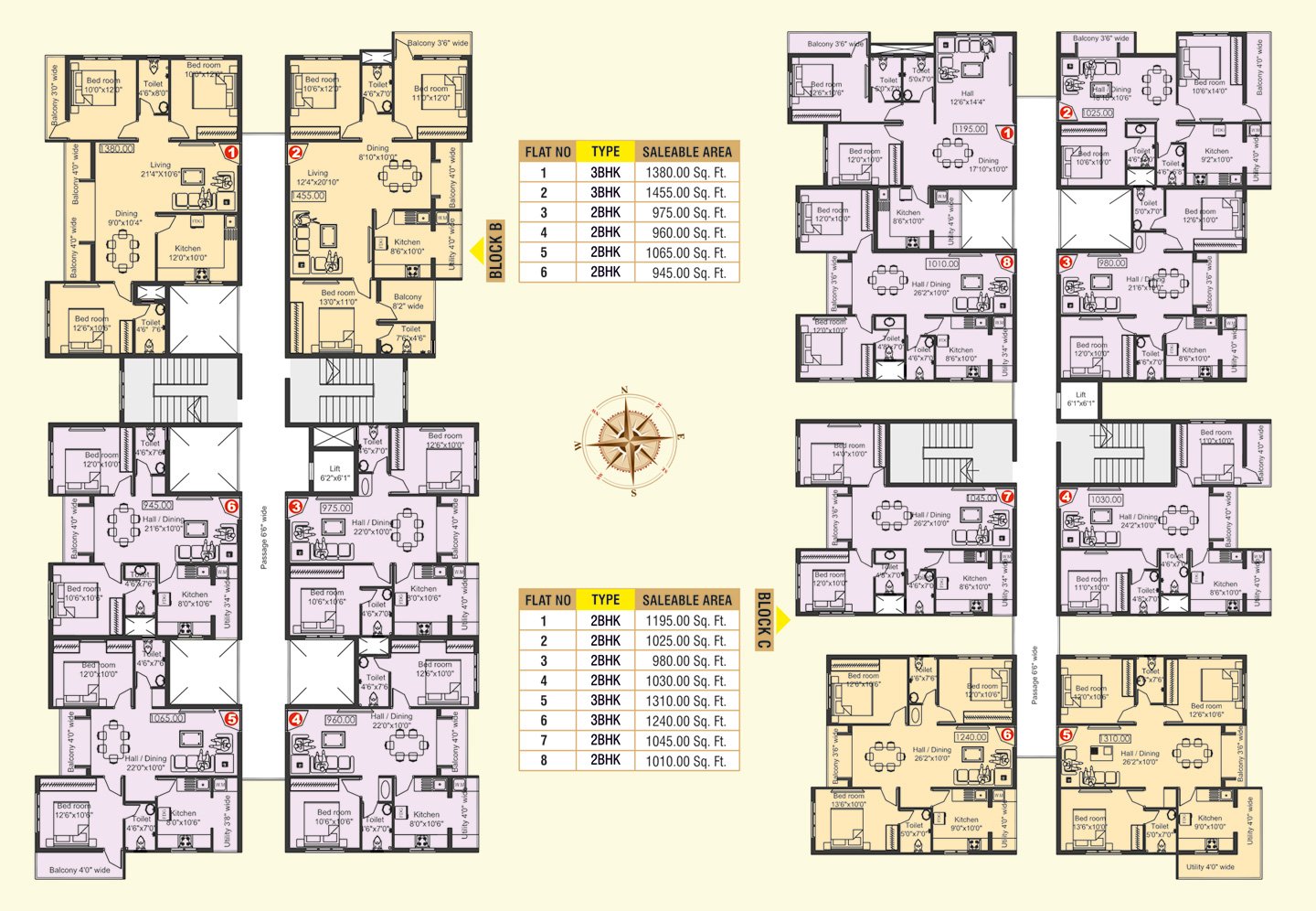 Currently Block C is under construction and it comprises of 40 flats with 8 flats built on each floor. Each floor comprises of 2 flats of 3bhk and 6 flats of 2bhk.